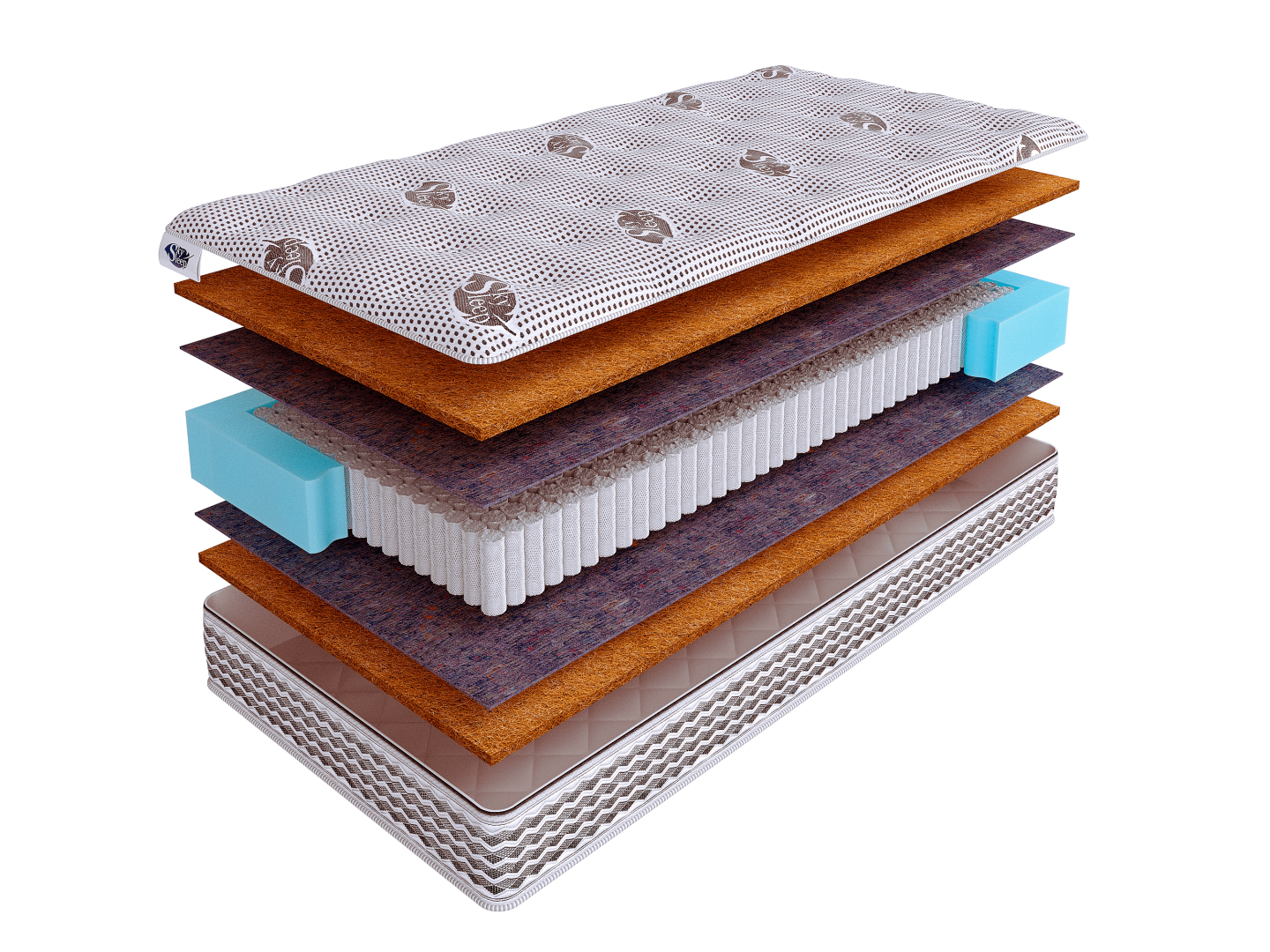 Это материал, обладающий такими качествами, как прочность, упругость и отличная воздухопроницаемость. Слои кокоса толщиной 1 см расположены по обеим сторонам модели и обеспечивают надежную ортопедическую поддержку для всего тела.